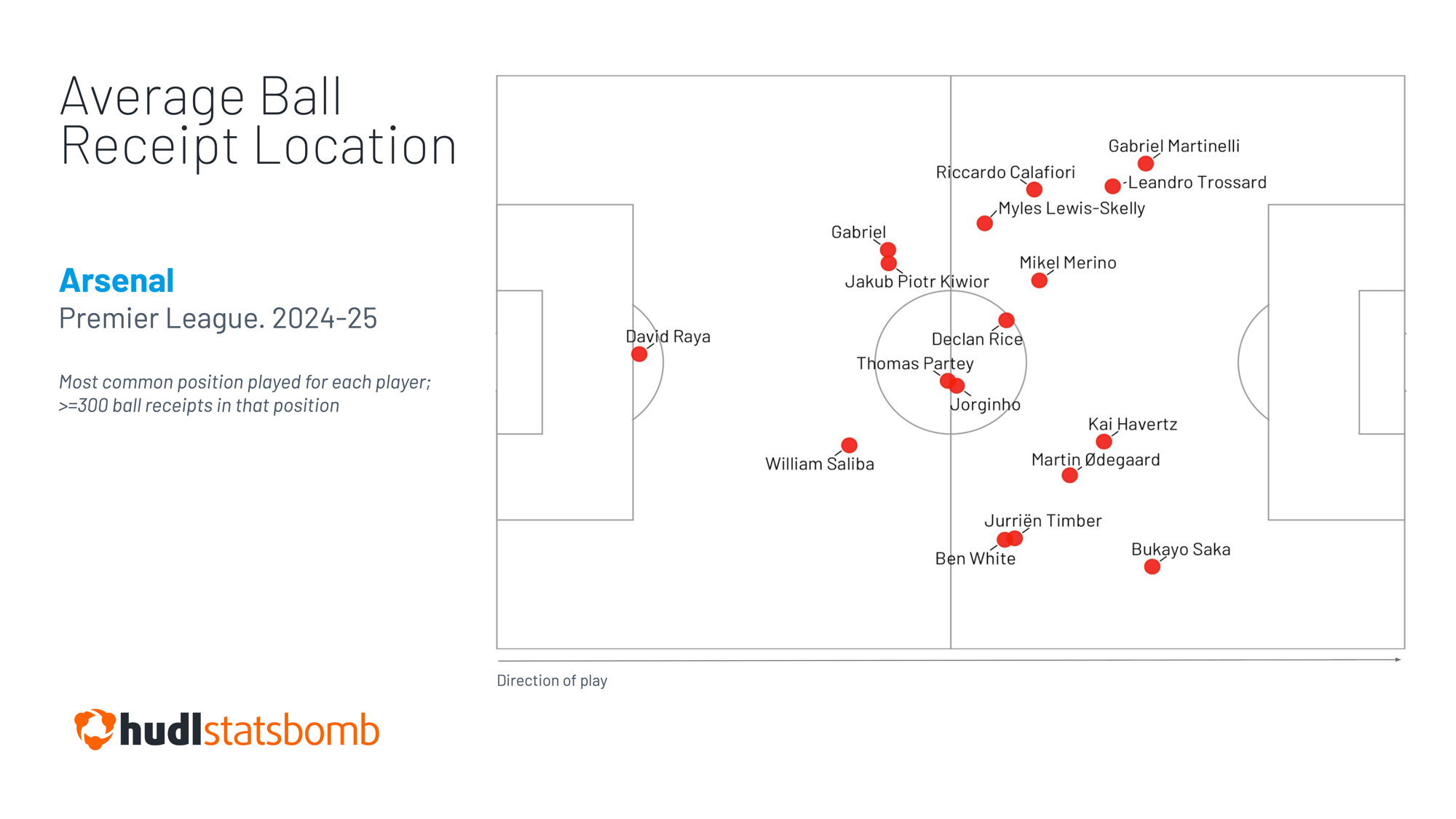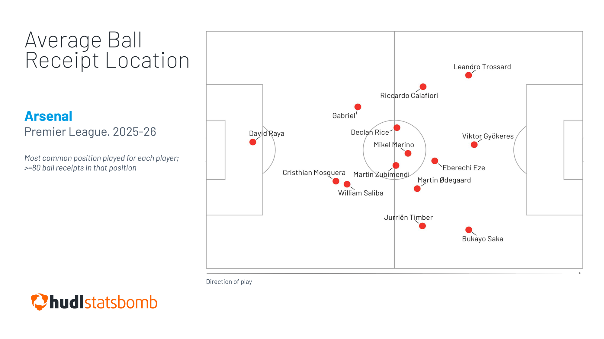 If we take the average ball reception location of Arsenal’s players last season, filtering to the position each player occupied most frequently…