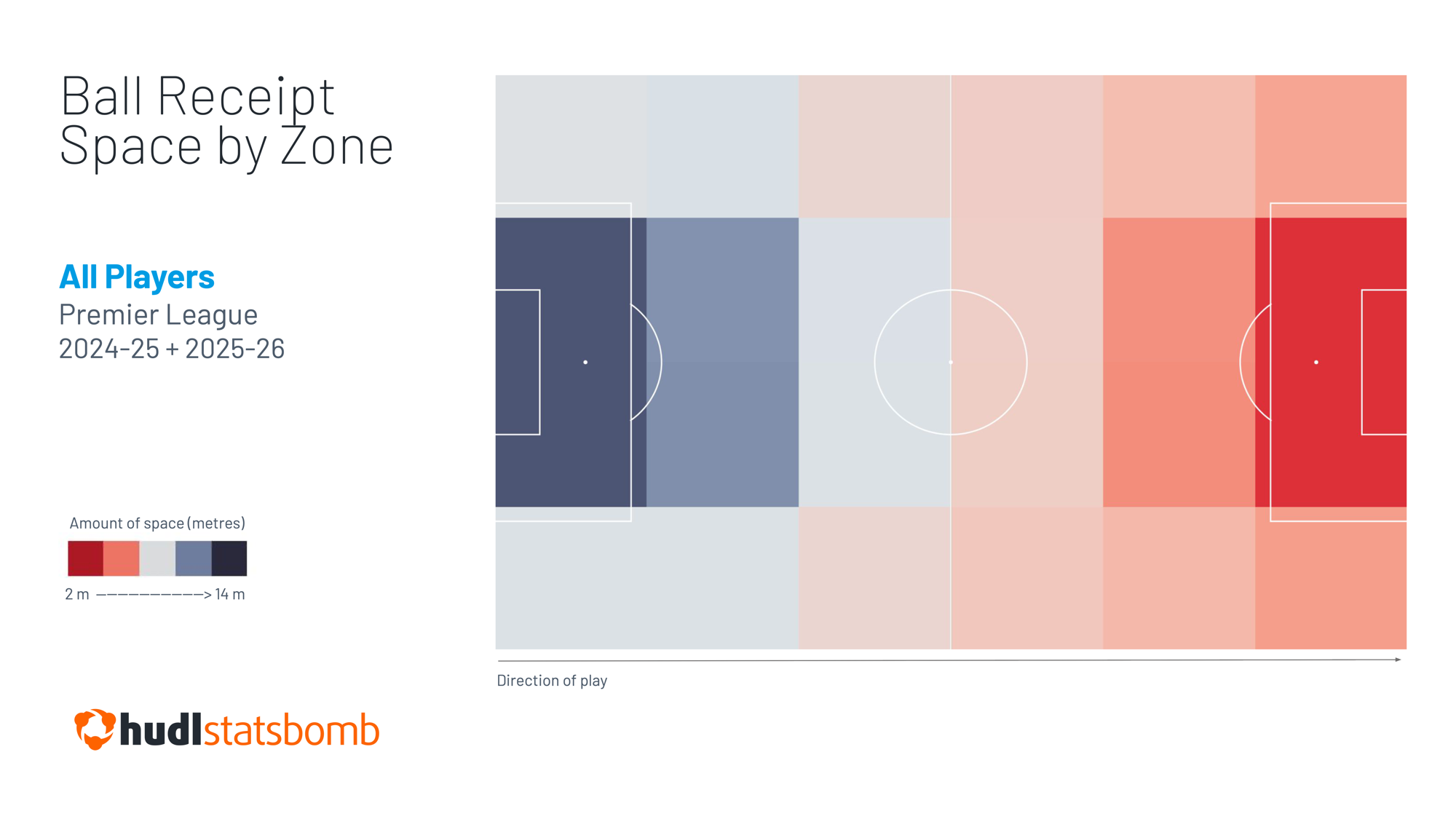 Our Statsbomb 360 data confirms the assumption that the further back a player receives the ball, the more space they generally have to work in (grey tones indicate more space; red tones, less space):