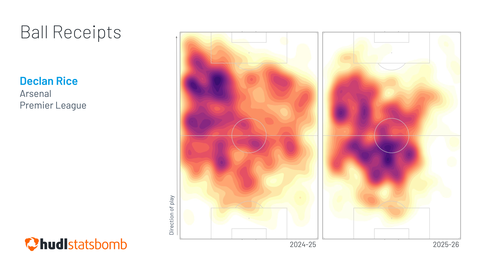 And if we map Rice’s ball receipts from this season versus last, it is immediately apparent that he is more often receiving the ball in those higher-space areas. Indeed, if we focus on just the central corridor of his own half, the percentage of his total ball receipts that occur in that zone has increased from 24% last season to 39% this time around.