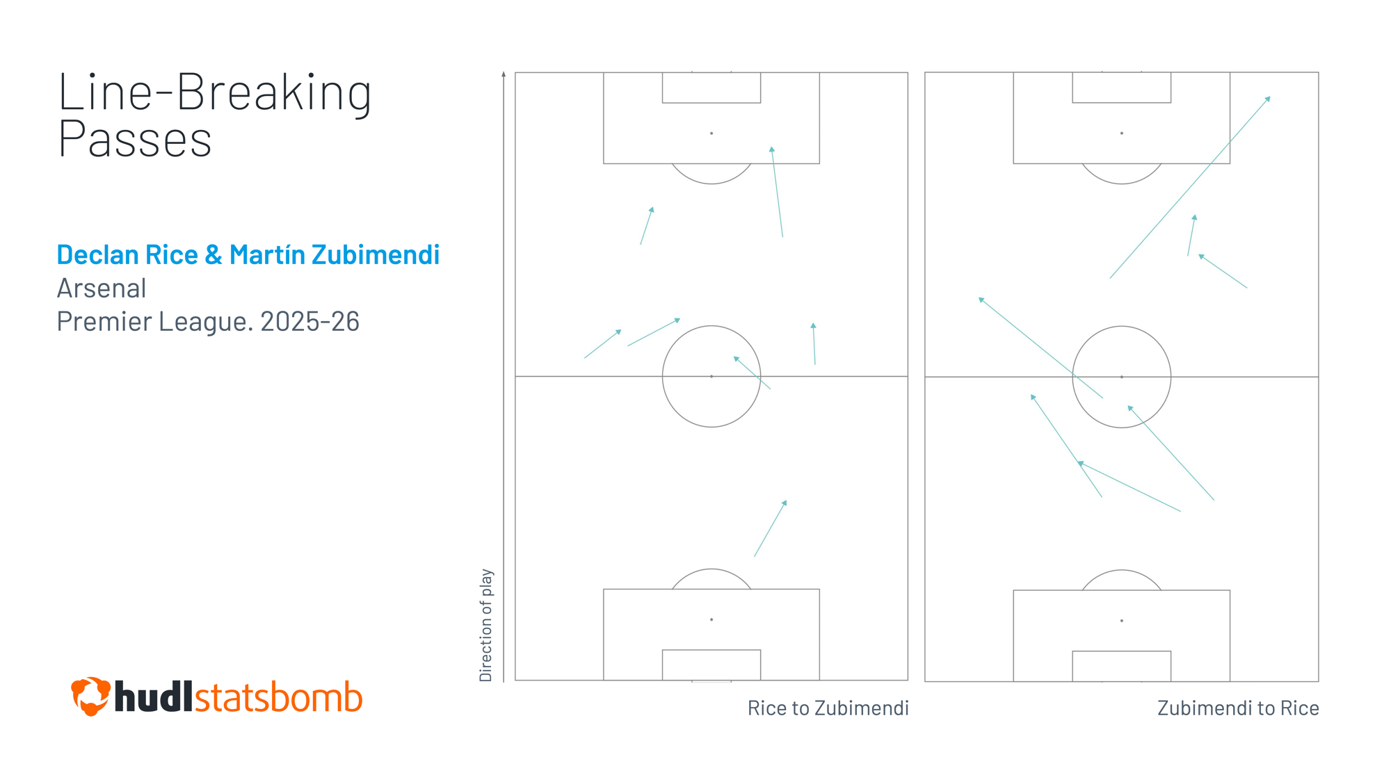 The other clear difference in who Rice’s line-breaking passes are aimed at involves Zubimendi, and highlights the strengthened midfield connection brought about by a more defined double pivot.