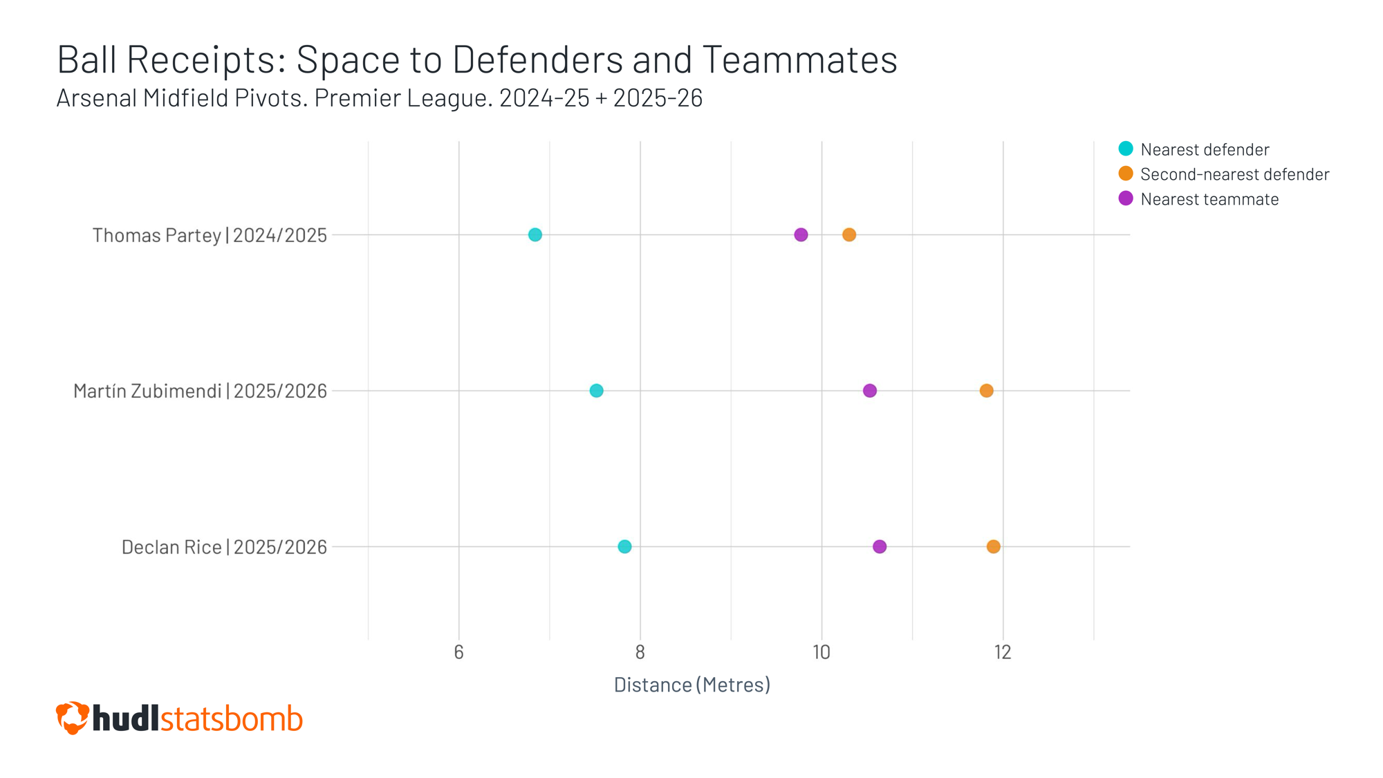 Not only do they have more immediate space, but on average, the second closest defender and their closest teammate are also further away than they were from Partey last season. Indeed, it is notable that even in the less-congested areas of the pitch, when Rice receives the ball this season he does so in more space than on the occasions he dropped into them last season.