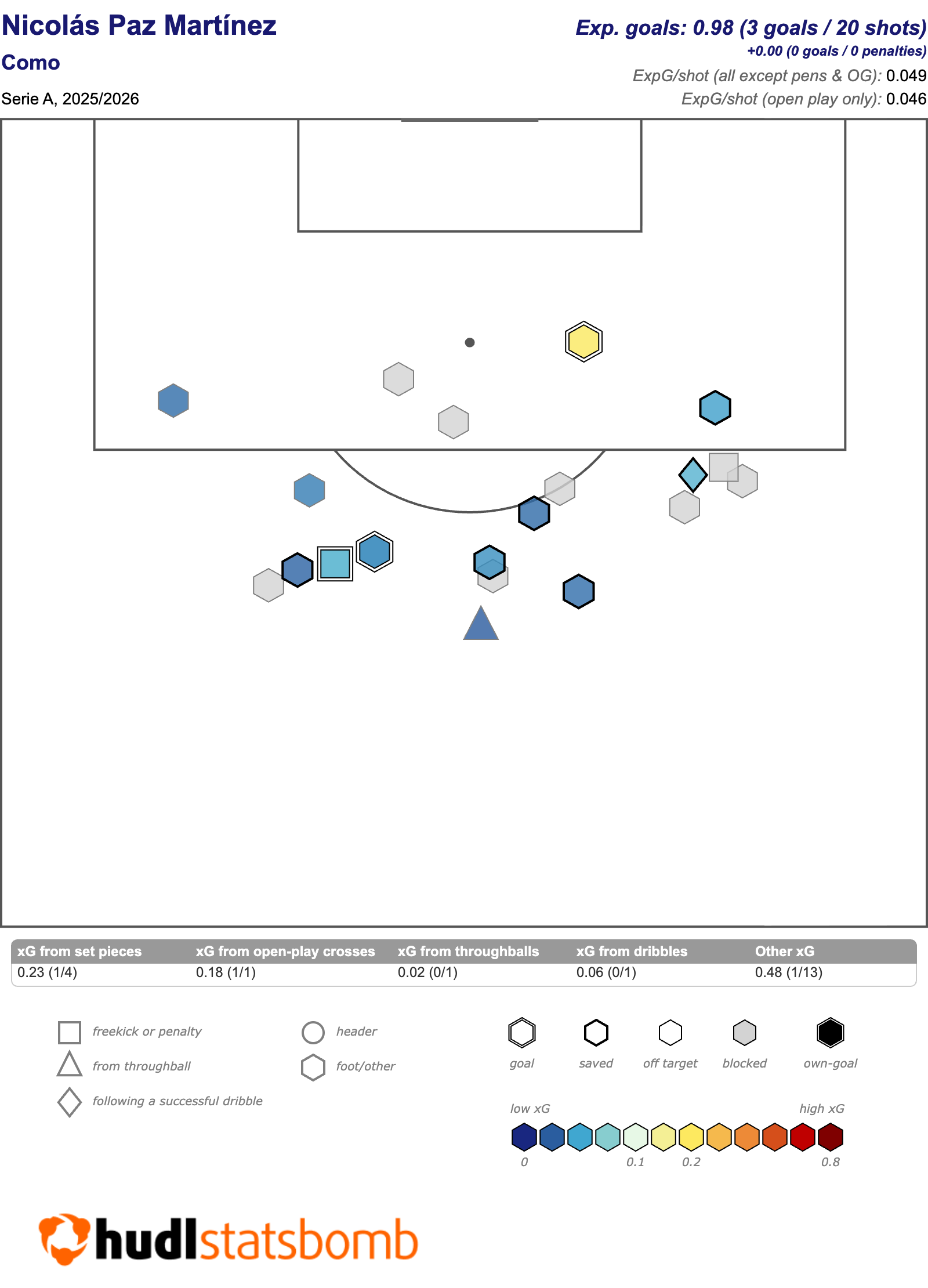 His goals have come from 0.98 expected goals — quite a noticeable gap, one that will probably even out as the season goes on. What explains the difference between expected and actual goals, though, is above all his technical quality: that gorgeous free-kick against Lazio and the missile from 25 metres out against Genoa, where he struck the ball after a pirouette, are the kind of goals that probably only he can score in Serie A.