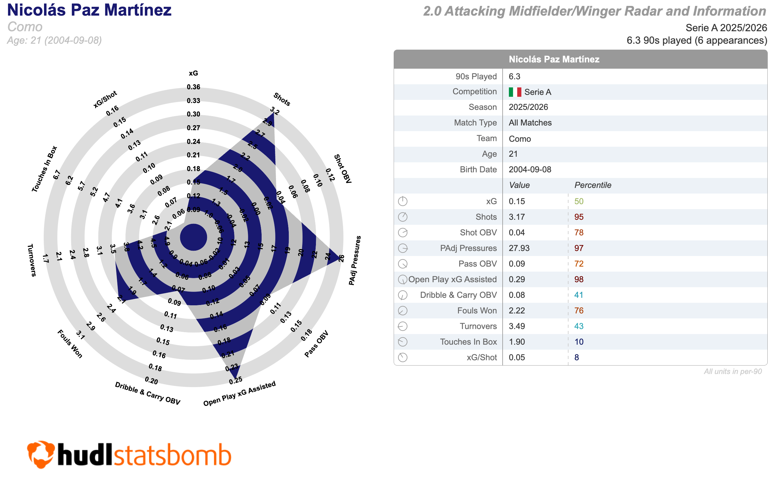 To show just how wide his influence is on the game and on his teammates, among all the attacking players in Serie A who have played more than 90 minutes in these first six matches, Nico Paz ranks second for passes received: 32.54 every 90 minutes.